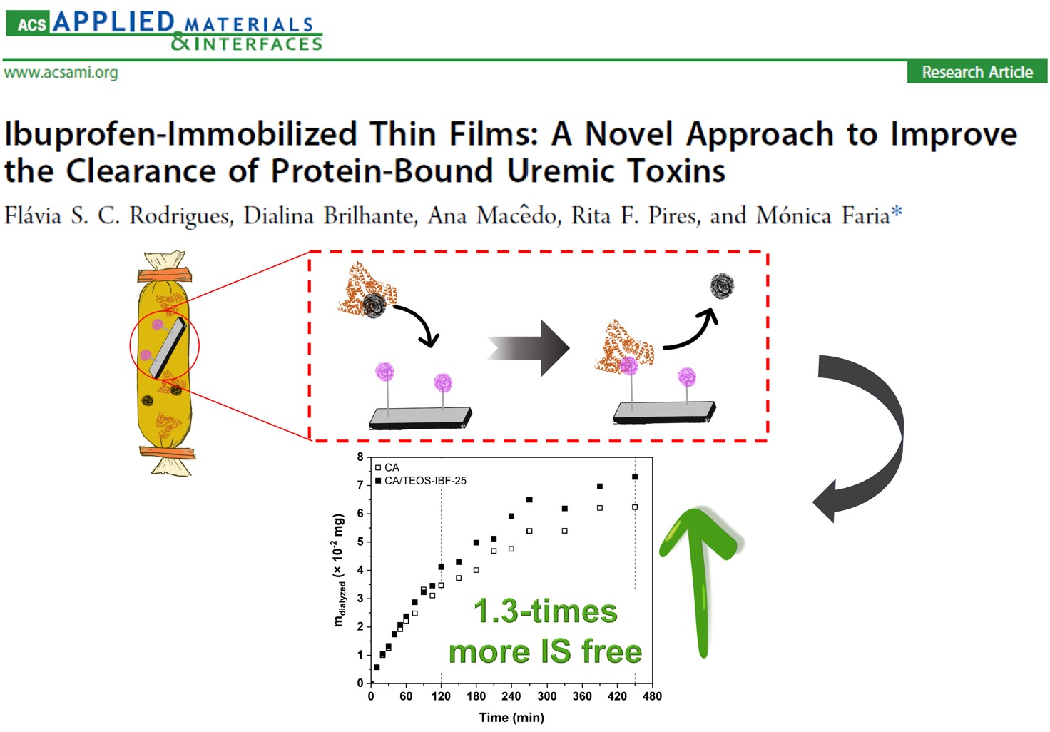 Rodrigues, F. S. C., Brilhante, D., Macêdo, A., Pires, R. F., Faria, M. (2024) Ibuprofen-Immobilized Thin Films: A Novel Approach to Improve the Clearance of Protein-Bound Uremic Toxins, ACS Appl. Mater. Interfaces. https://doi.org/10.1021/acsami.3c15291